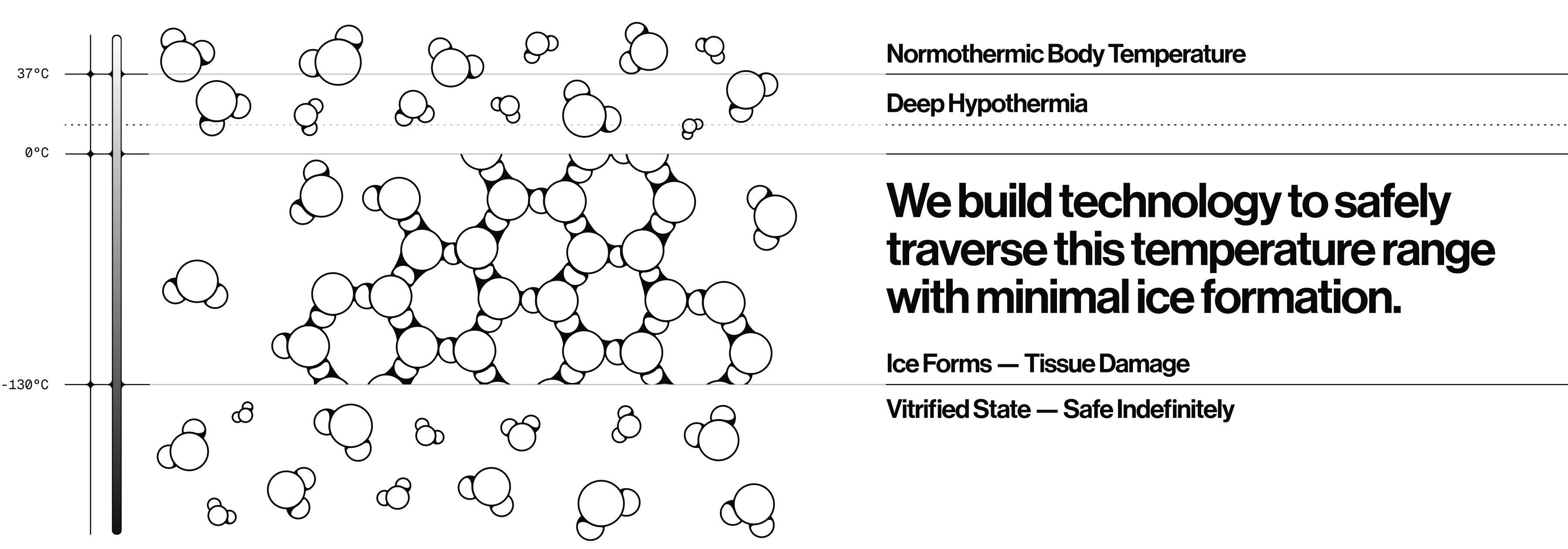 As temperature drops, viscosity increases. Below -130°C, all molecular motion stops3. It's like pausing time. At -130°C, water molecules can’t rotate to click into an ice crystal formation. At -60°C, this rotation could take a fraction of a second, but at -130°C, it takes a millennia4. This is where we need to go for long term organ preservation.
