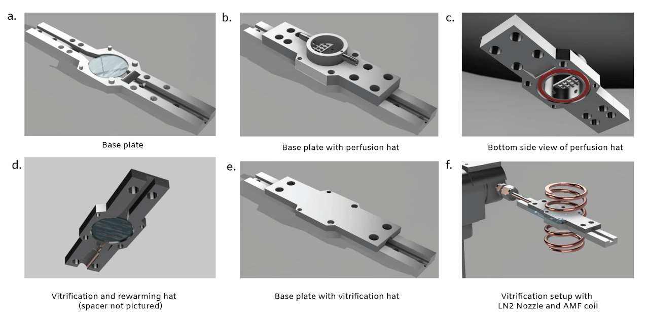 We designed 3 custom parts for this experiment (see CAD files), including a common base plate with two “hats” meant to support 1) loading and unloading of CPAs into a slice of tissue (Fig4b and Fig4c) and 2) vitrification and rewarming of the tissue (Fig4d-f). These parts were printed on a FormLabs 3B printer in Tough 1500 resin. For final assembly of the base plate (see CAD), a 20mm diameter, 500 µm thick double-sided-polish sapphire disk was attached to a 19mm diameter, 250 µm thick carbon-steel disk shim using MasterBond EP29LPSPAO-1 Black (Fig1c and Fig4a). This sapphire and steel wafer was epoxied into the base plate, leaving the sapphire side exposed.